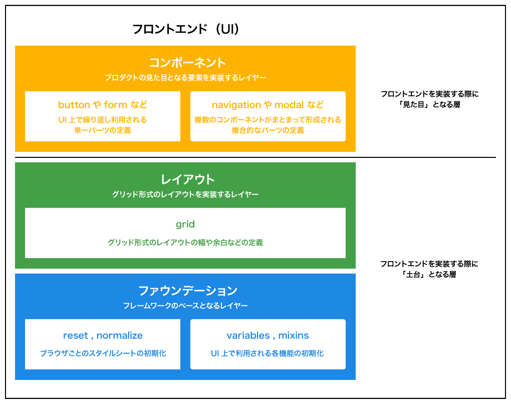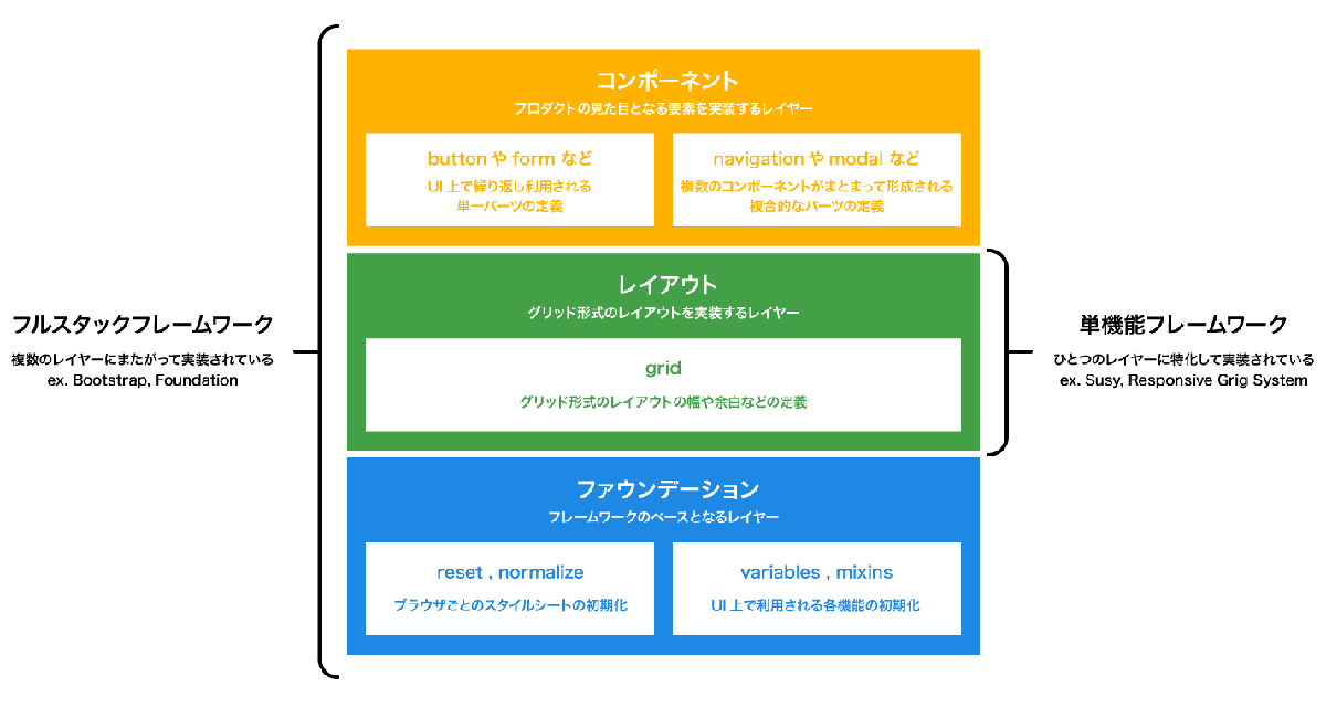 フロントエンド上で実装されるレイヤーとして定義してみました。コード上では、まずは初期化するためのスタイルがあり、それを利用してコンポーネントやヘルパークラスなどが設計されています。Sass版のBootstrapのコードを読むと CSS フレームワークが階層構造でつくられているのがわかるでしょう。それぞれのレイヤーに役割があり、フレームワーク導入の際には、上記のどのレイヤーを置換するかということを決めます。