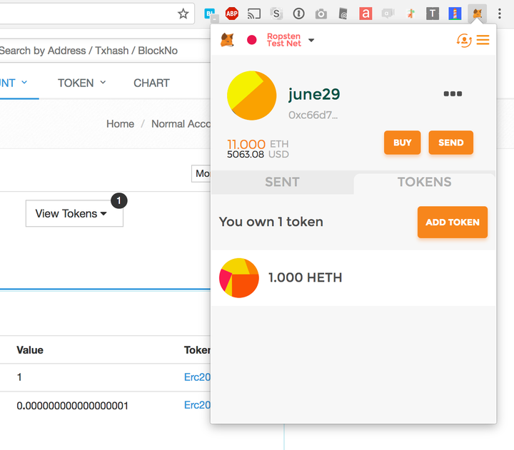 ちゃんと、HiEtherTokenという名前のERC20トークンとして認識されているようですね。
