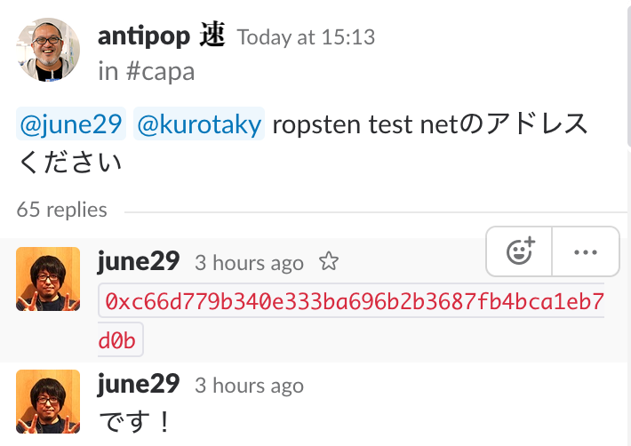 さて、自分に付与されただけでは物足りないので、ネットワーク経由で、周囲のひとに送ってみましょう。ここでは、同僚の@june29さんのアドレスに送ってみたいと思います。