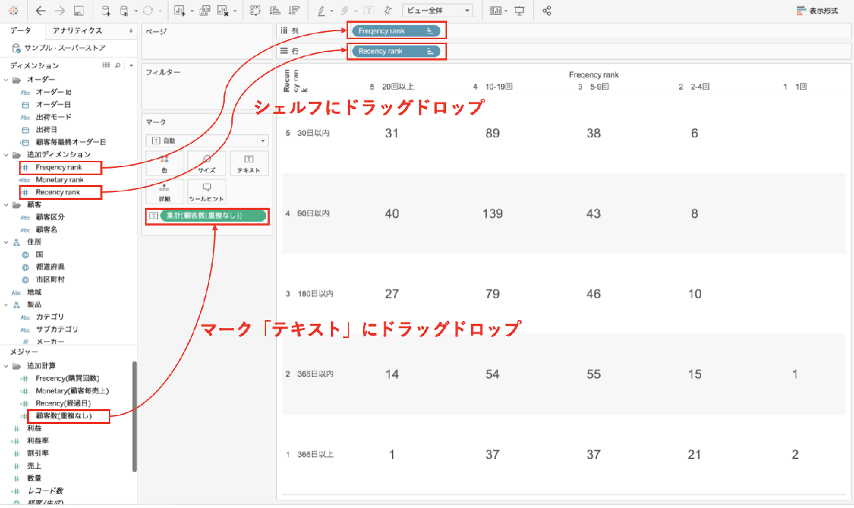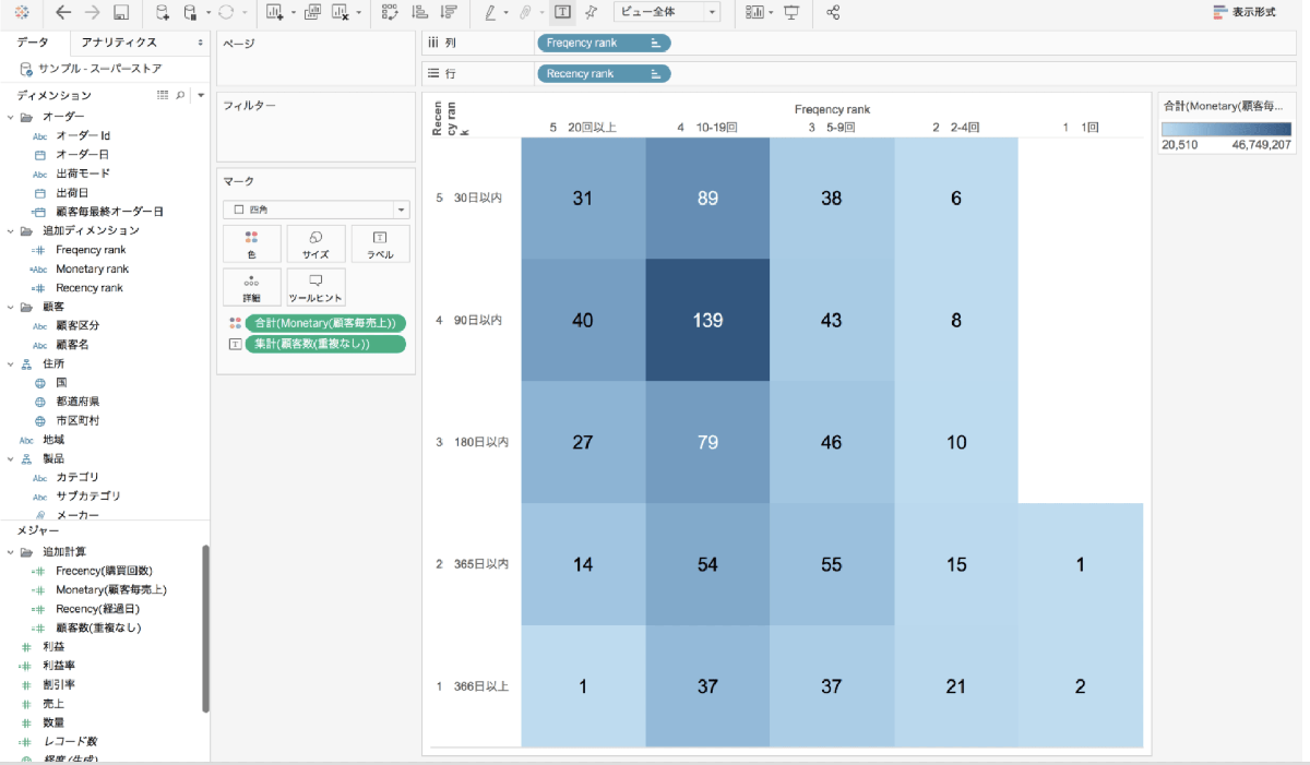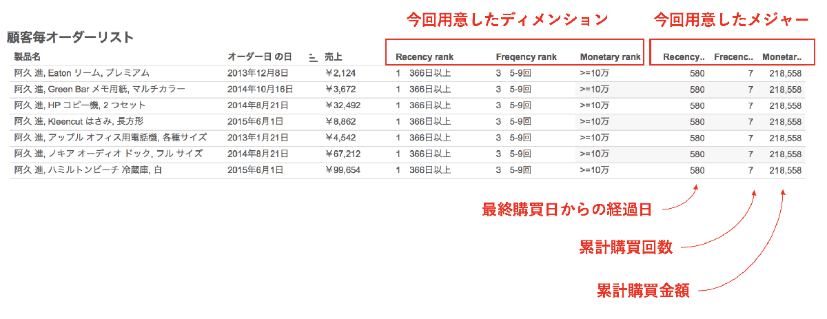 表の形で確認すると追加された各要素が作用していることがわかります。 このままだと顧客毎にデータを見なければならないので、全体を一気に把握するために可視化作業を進めます。 ※データは「サンプル・スーパーストア」を使用