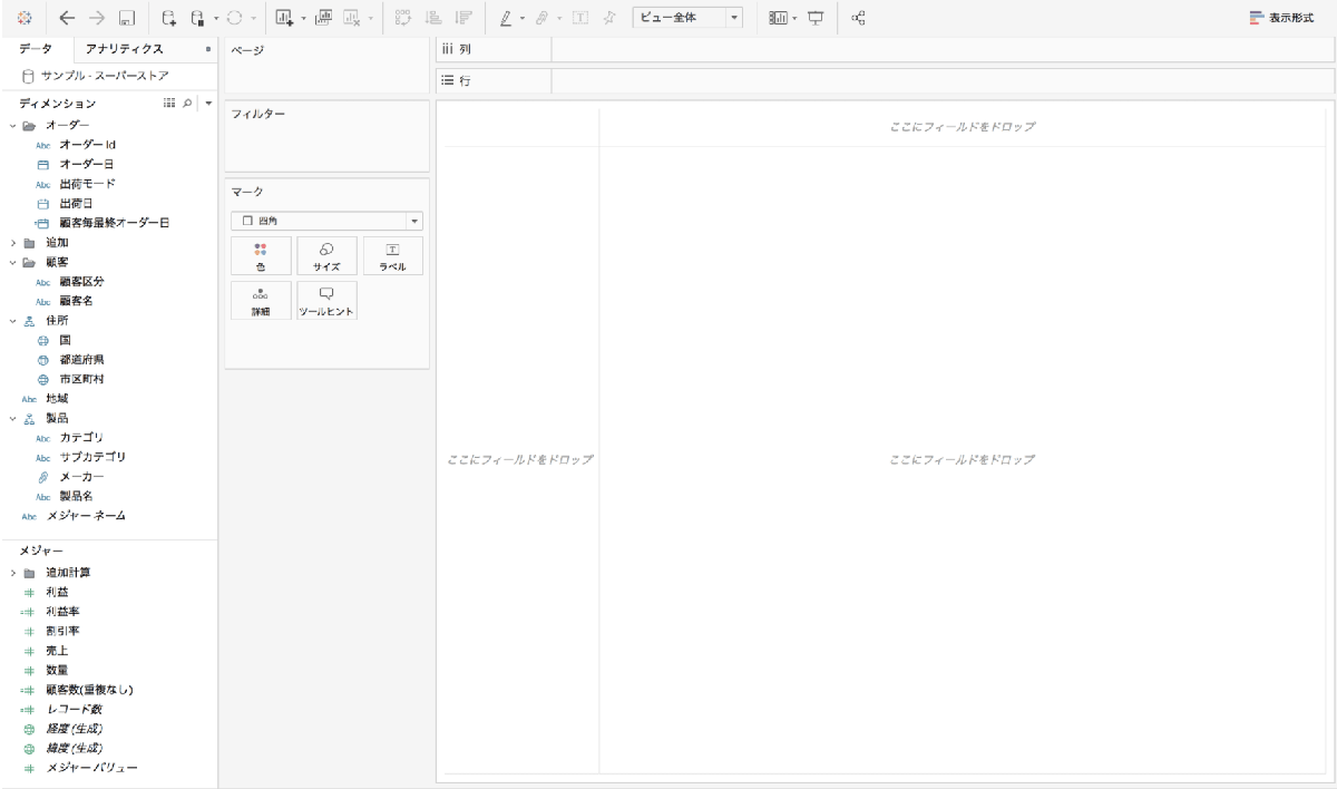 こちらがTableauで「サンプル・スーパーストア」を読み込んだ直後の画面です。