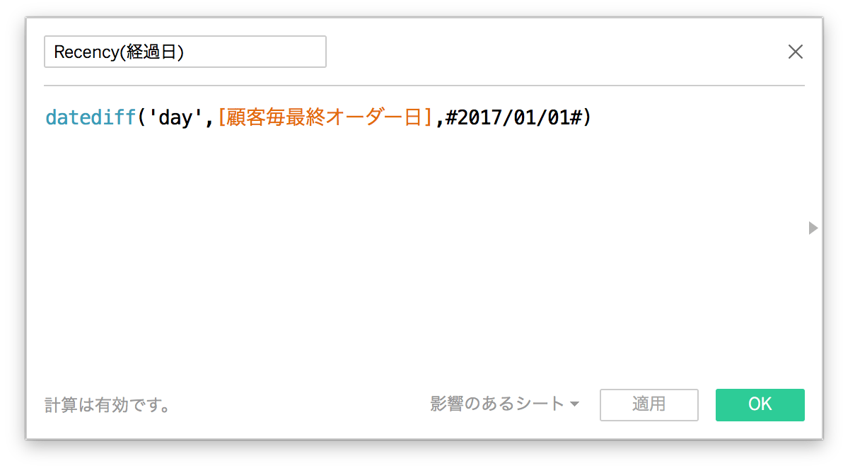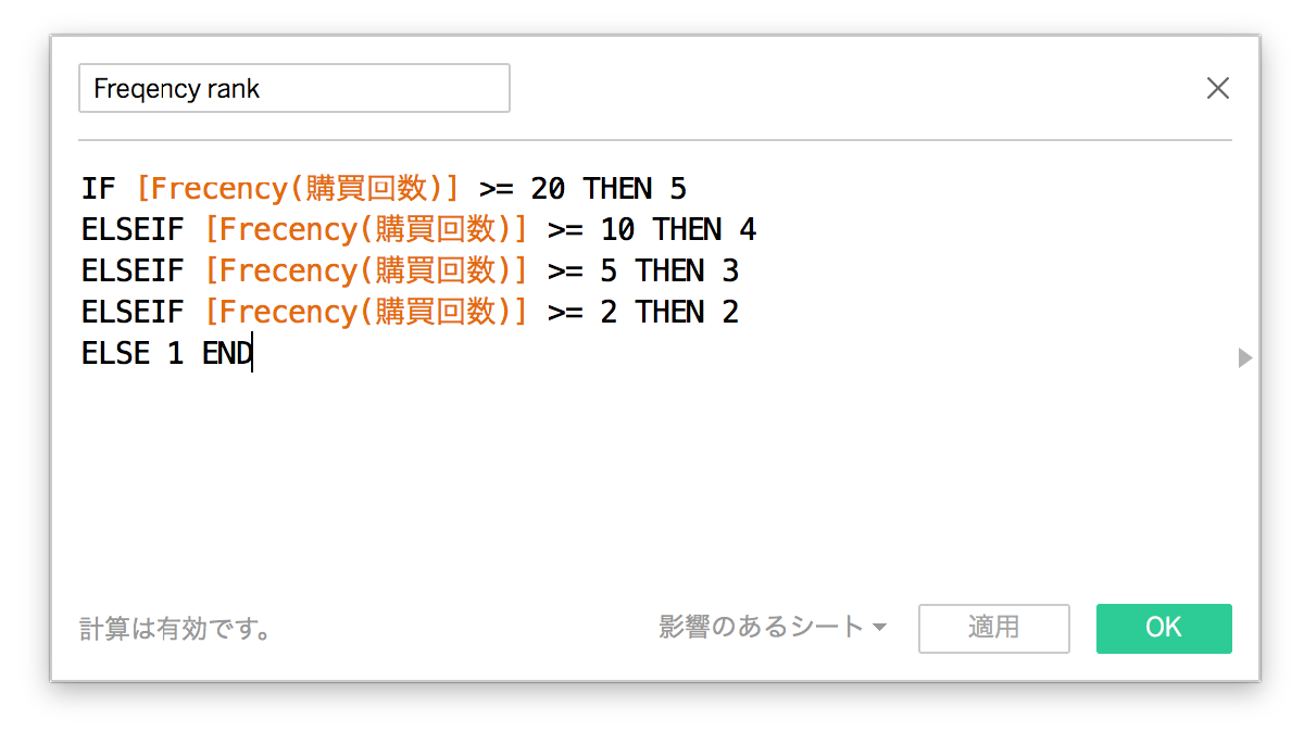 RecencyやFrequencyなどの値をそのまま使うと項目数が大量になってしまうため、IF関数を使用してディメンションのグループを作ります。