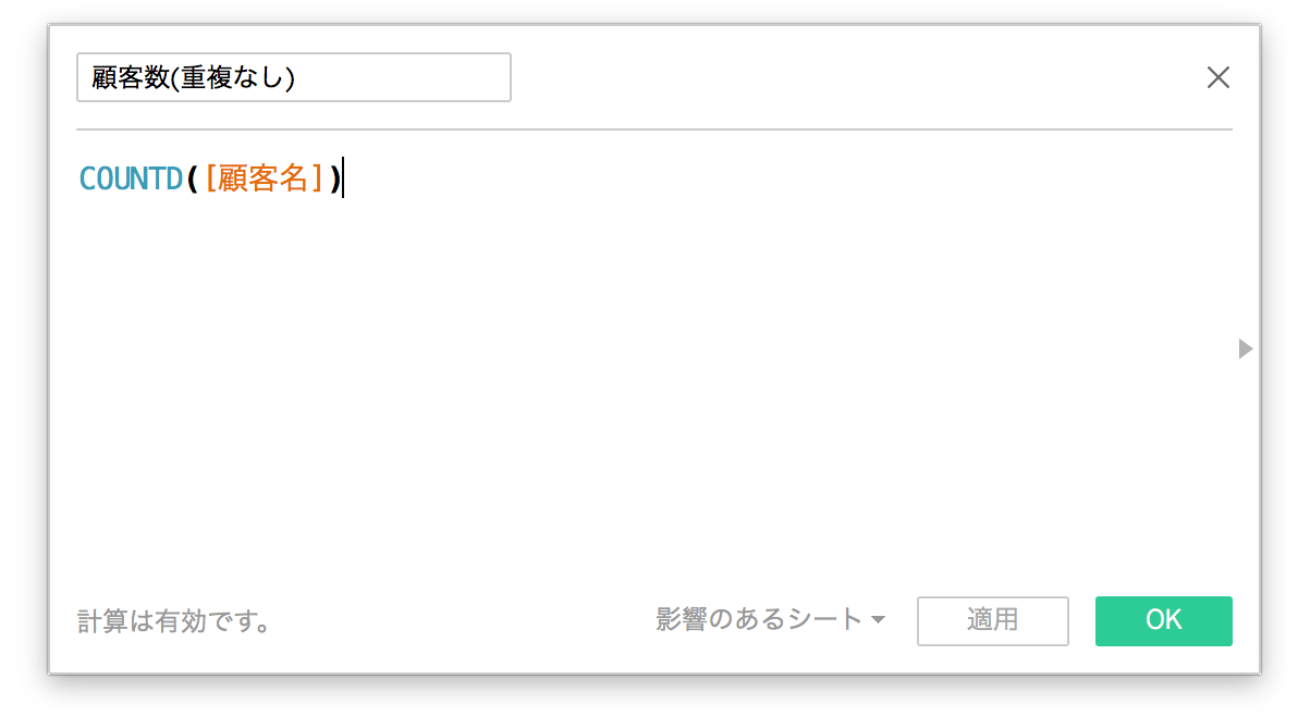 サンプルデータの顧客名は重複するレコードがあるので重複のない件数を出します。