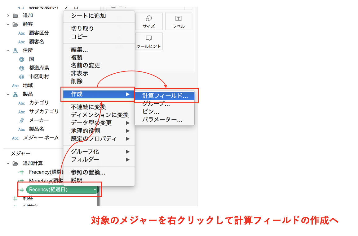 「計算フィールドの作成」にて新しいメジャーを順に作成します。
