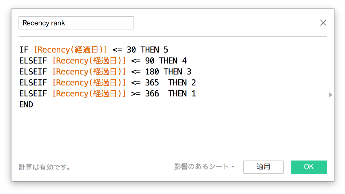 ELSEIF [Recency(経過日)] <= 90 THEN 4