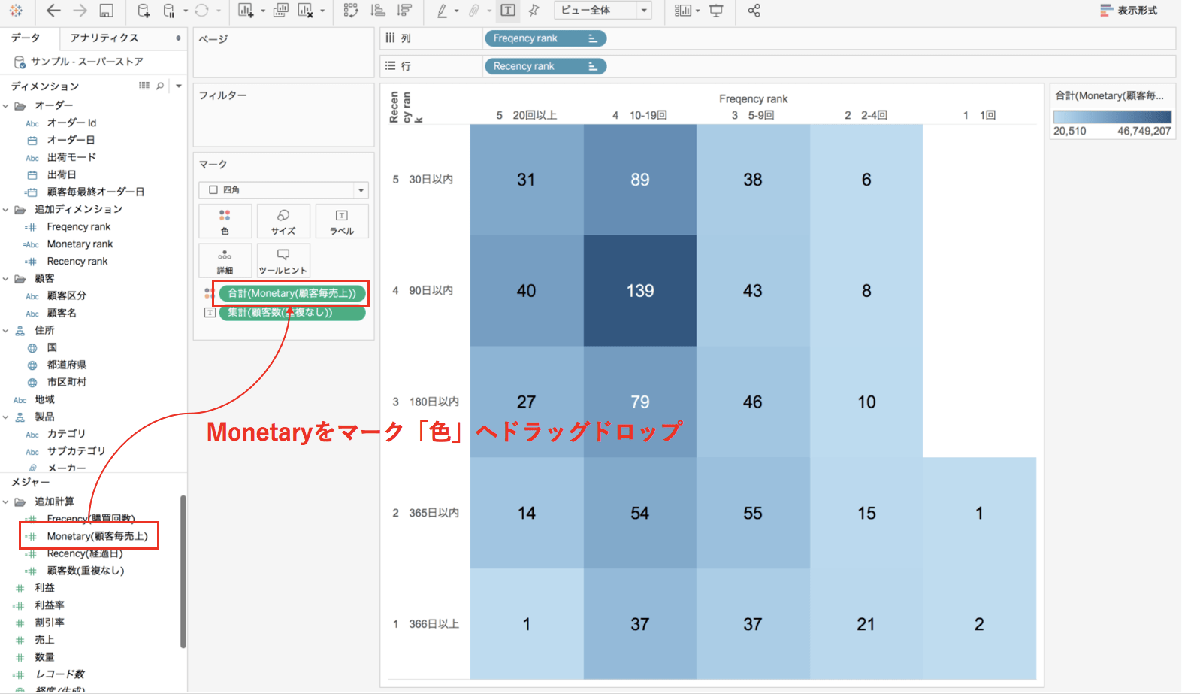 メジャーのMonetaryをマークの「色」へ配置します。