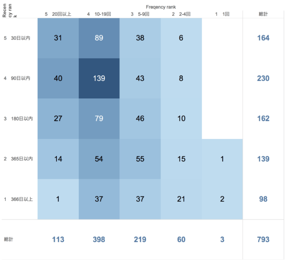 また、今回はRecencyとFrequencyのクロスですが、例えばRecencyとMonetaryなど軸を入れ替えながらデータを俯瞰すると新しい発見があるかもしれません。