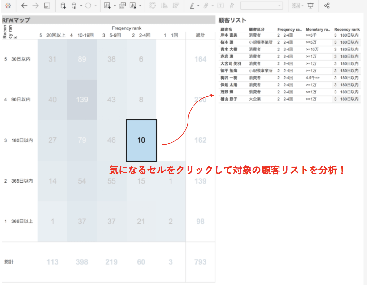 今回の場合RFMチャートと顧客リストを連動させることで対象の顧客がどういったタイプかを細かく分析ができます。