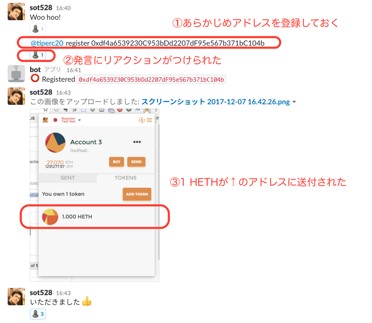 図中の③について。Hi-Etherコミュニティに参加するには、Ropstenのアカウントが必要です。Ropsten上でのERC20トークンの保有量を調べるには、MetaMask拡張が便利です。ここでは、②のリアクションによってtiperc20によって1 HETHが送られたことが確認されています。