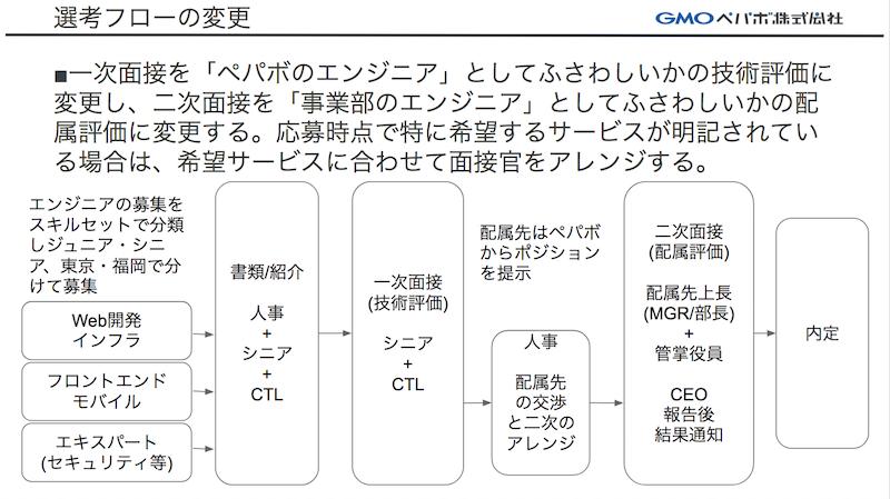 まず、入り口については、ペパボが事業として営んでいる領域ごとにポジションを表示するのではなく、ペパボのエンジニアとして何をやりたいのか、ということを応募者がすぐに選べるようにしました。その上で選考の面接の回数とそれぞれの面接での判断の観点を変更しました。変更後のプロセスでは、1次面接で全ての技術的な評価を下す必要があります。従来は徐々に役職の高いメンバーが面接を行う形式だったため、最終的なジャッジは後の面接を行うエンジニアに委任することが可能でしたが、新しいプロセスでは一回の面接で判断を行う必要があります。