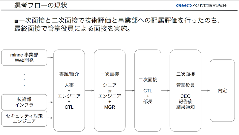 GMO ペパボのエンジニアの従来の採用プロセスは上記の図のように、3次の面接まで、技術と事業部それぞれから面接官が参加する形式を取っていました。また、後半の面接に行くに従って、例えばエンジニアの場合は1次面接では同じチームのエンジニア、二次面接では同じ事業部のCTL(チーフテクニカルリード)というように、より役職の高いメンバーが参加することが多かったようです。また、エンジニアとして募集を行う職種も事業部ごとに設計されていた、というのが特徴です。