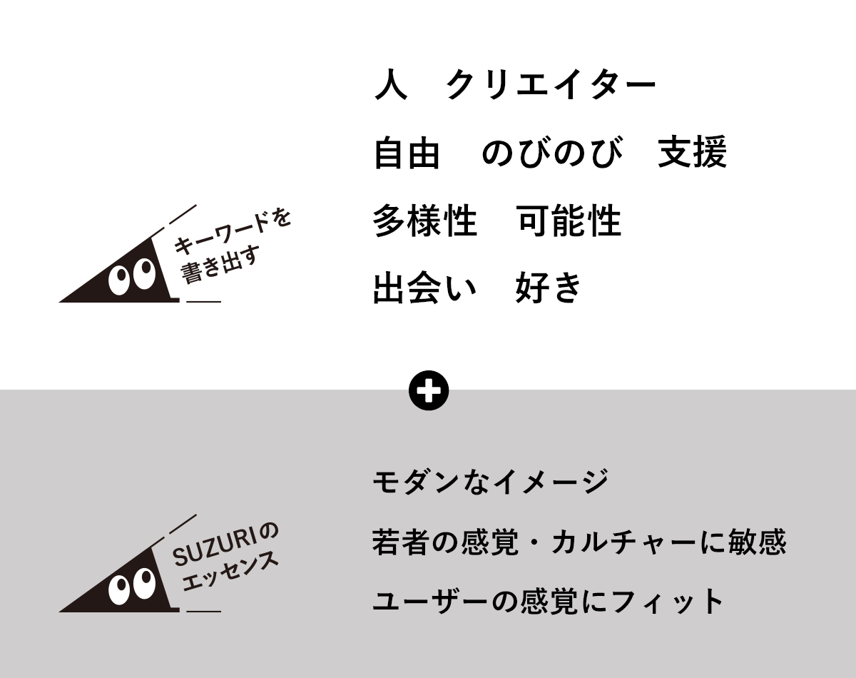 新時代を開くサービスとして、新しいワクワクを感じ、印象に残るものにしたい。 また、すでにイメージを確立している親サービス 「SUZURI」 の持っている世界観も生かしていきたいという気持ちもありました。