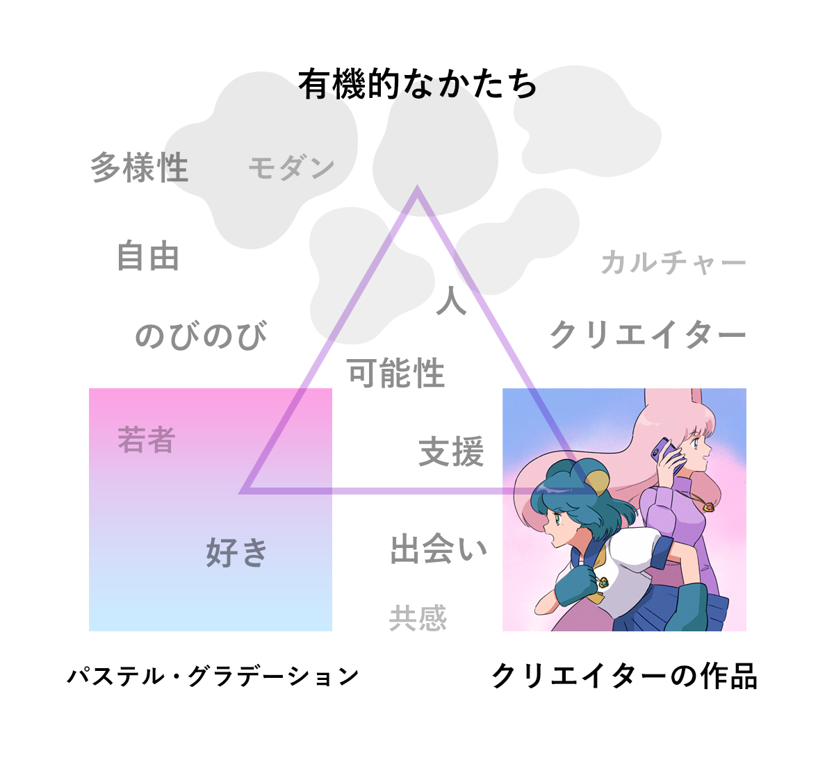 グラデーションを使うことで、若者的な感覚や、動き、変化を。グラデーションにパステルカラーを合わせることで、優しくもどこかドキドキ、ワクワクするような気持ちを演出していきました。