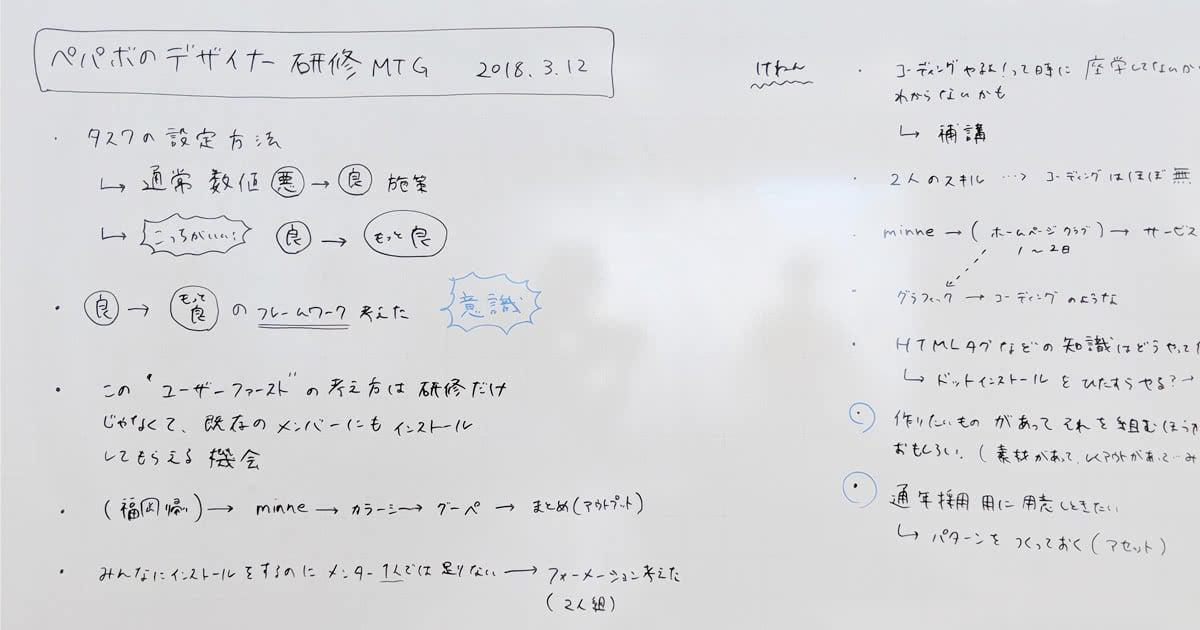 ペパボでは、社会人として知っておきたいマナーを身につける研修からはじまり、ペパボの文化や事業を知る研修や、実際にカスタマーサポートの業務を通じてユーザーとコミュニケーションをとるなど、仕事の進め方を体験できる研修を用意しています。約2ヶ月におよぶこれらの研修を終えると、ほとんどのパートナー(ペパボでは社員のことをパートナーと呼んでいます)はさっそく事業部へと配属されますが、デザイナー職のおふたりにはさらに専門性を獲得していただくべく、5週間にわたって「新卒デザイナー研修」を実施しました。