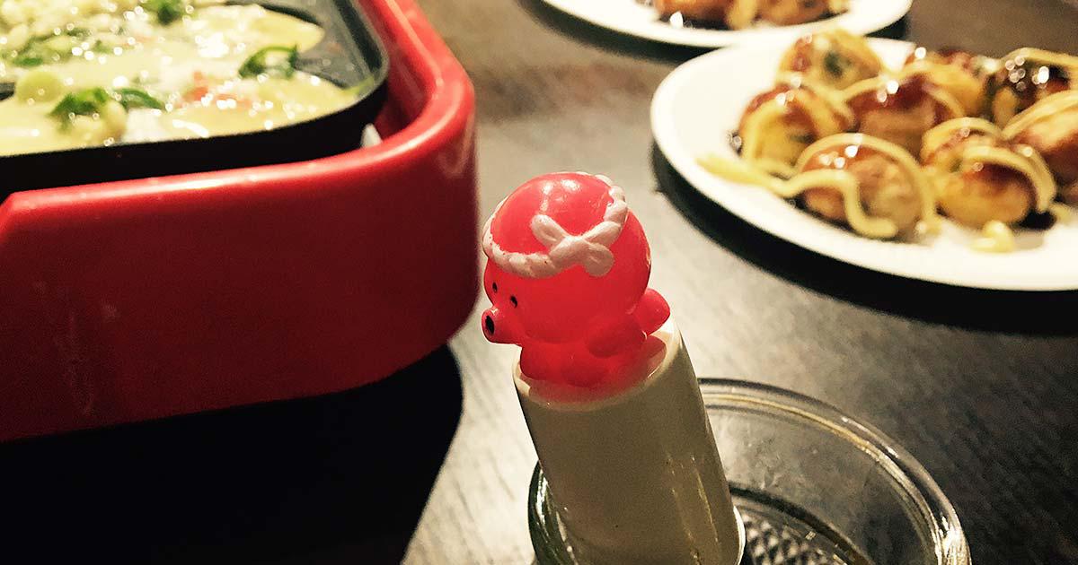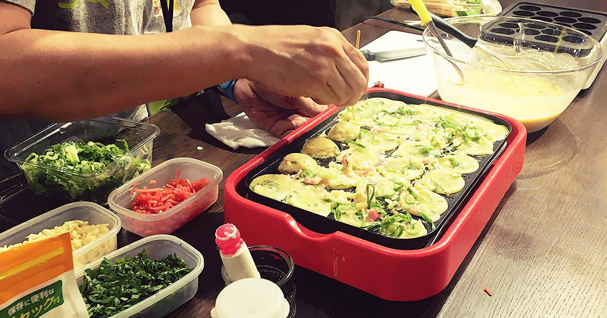 背後のカウンターでは、懇親会のメインディッシュになるたこ焼きも固まりだしています(いい匂い)。