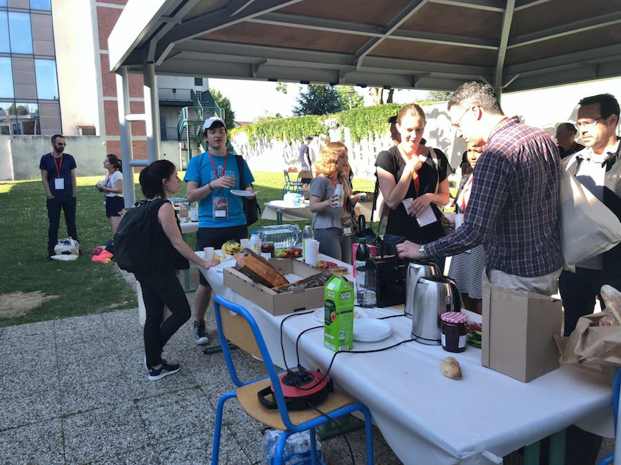 この Efrei Paris に限らず、フランスの 6-7 月は 1 ヶ月雨が降らずに晴天が続くという外で過ごす人が多い季節になっているらしく、上の写真のように外の芝生の上にテントや食事のスペースを用意して、日光浴を楽しんだり昼寝をしている人をよく見かけました。写真には写っていませんが、カンファレンスの最中もフランスパンを食べながら芝生に座っておしゃべりをしている人がたくさんいました。