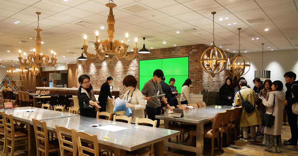会場は、ウッド調のシャンデリアが天井からぶら下がり、レストランのようなカウンターやテーブルが並ぶ広々としたゾーン。