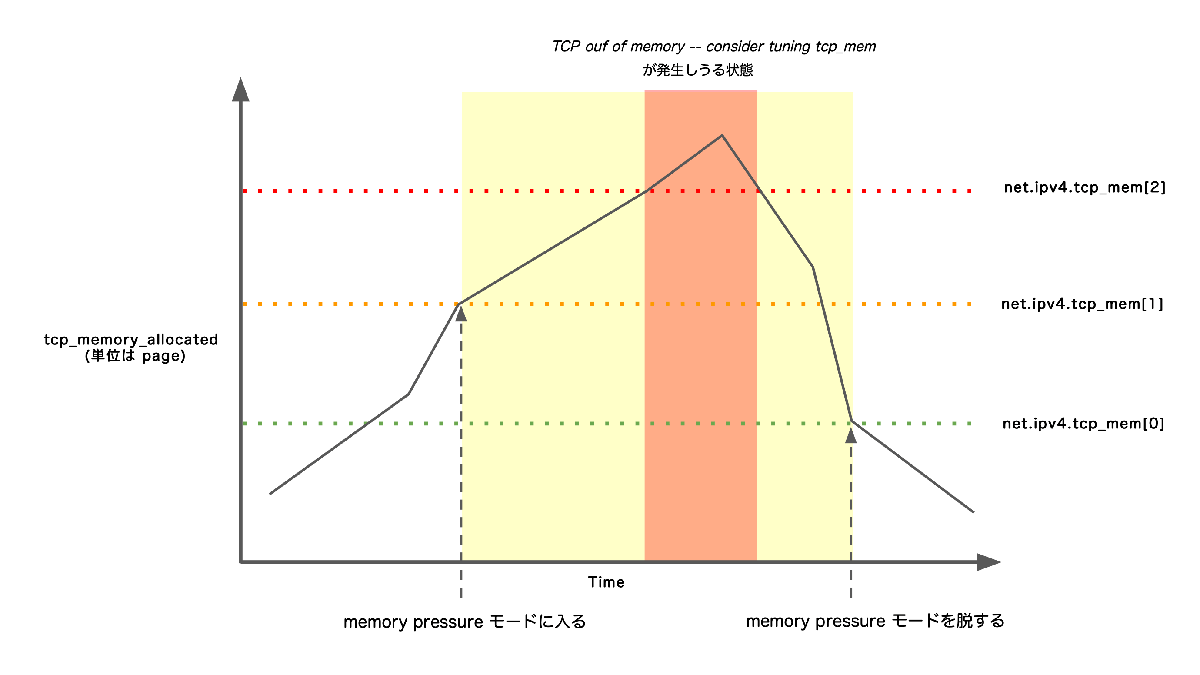 - Linux カーネルが、TCP ソケットに送信・受信バッファに割り当てたメモリ(ページ数) が 閾値 を超えている