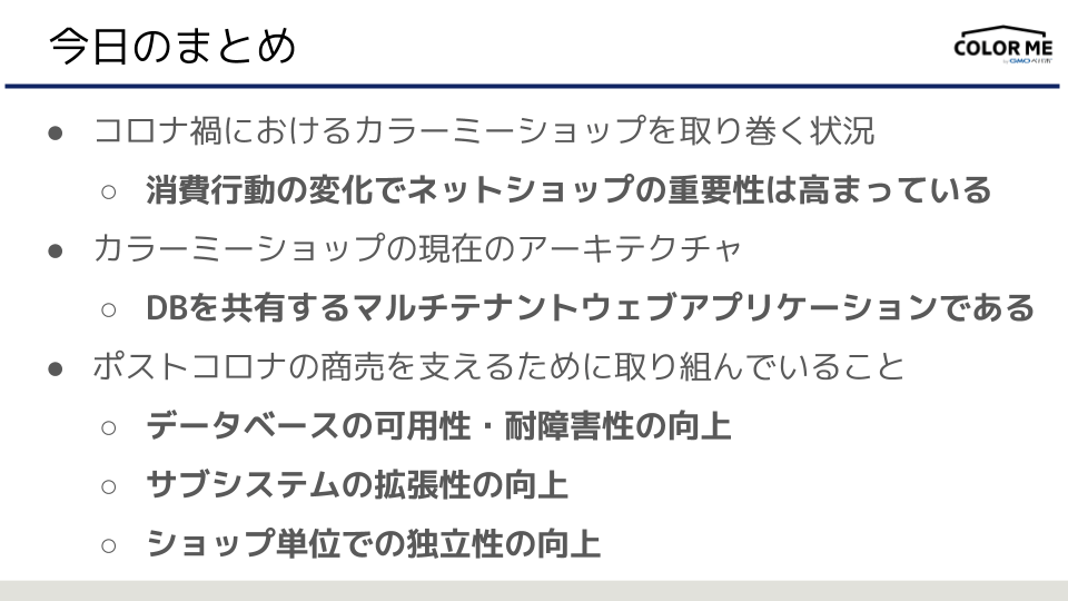 私のセッションでは、カラーミーショップの昨今の状況、ポストコロナにおける消費行動の変化からくるネットショップの重要性の高まりに対し、3つの方向性で、システム全体のRe-Architectingにとりくんでいることをお話しました。