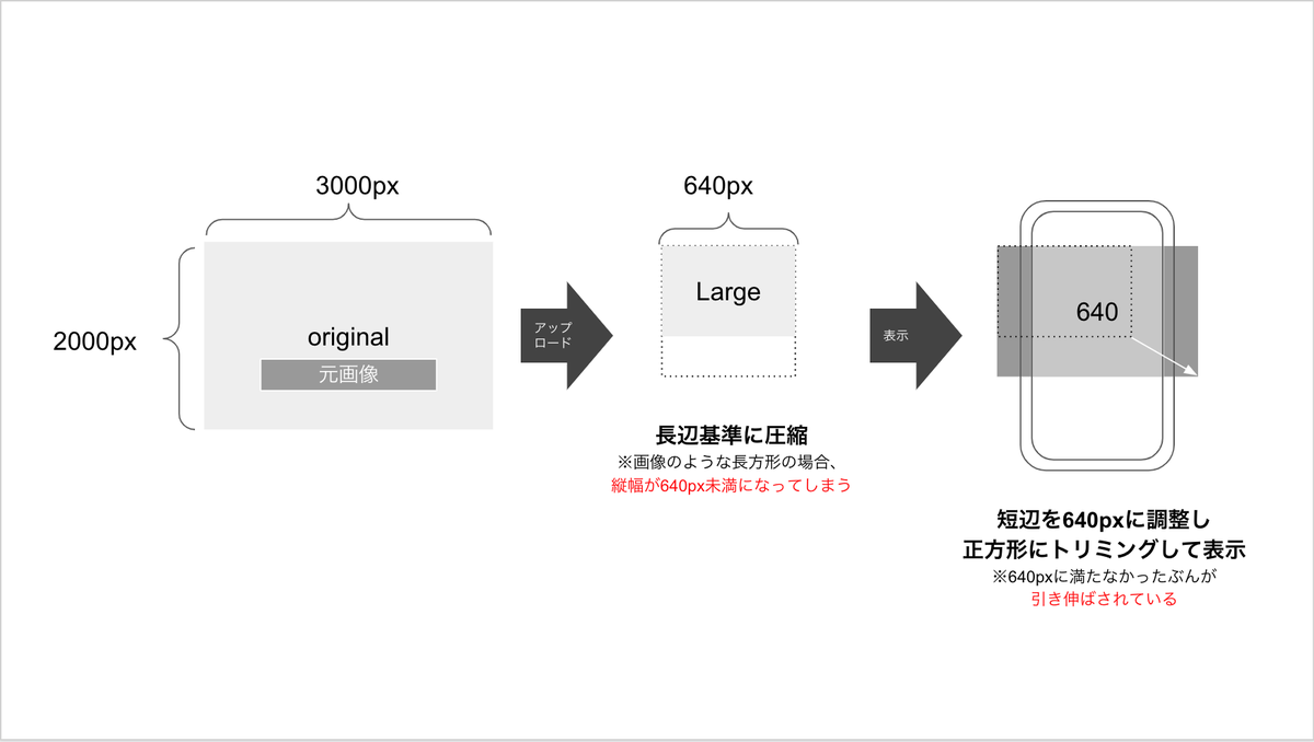 画質が低下する主な原因は下記の画像を参照して頂くとわかりやすいのですが、元々 minne ではアップロードされたオリジナルの画像をアスペクト比を保ち長辺が 640px になるようにリサイズして保存していました。そのリサイズ後の画像を元に短辺を 640px に動的に変換して表示を行っていた為に、画像が引き伸ばされ結果として画質が低下するという問題に繋がっていたのです。
