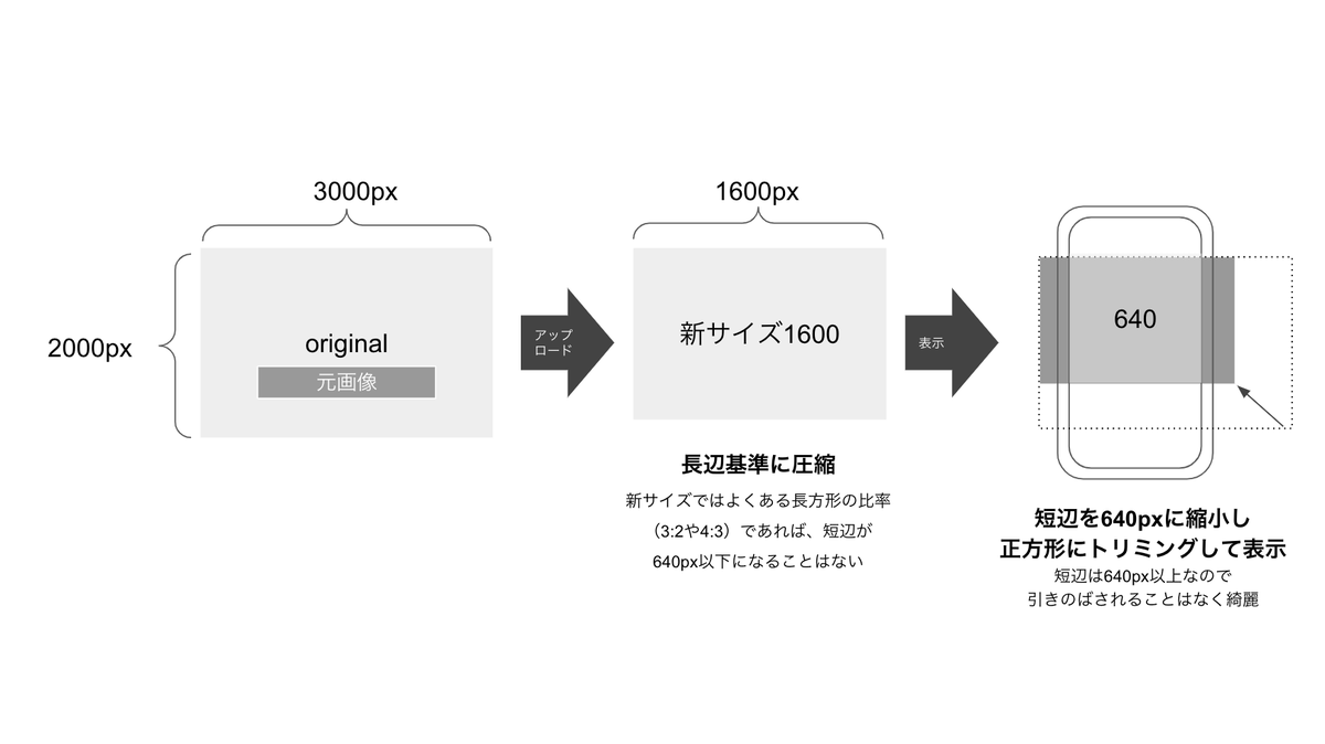 この課題を解決する為に下記のような方式に変更しました。基本的な流れは同じですが、リサイズ時に長辺が 1600px になるようにリサイズし、その画像を元に短辺を 640px に動的に変換して表示を行うようになりました。オリジナルのみを保存し、オリジナルから直接動的に変換する方法も検討しましたが、オリジナルの画像サイズが大きいほど、またオリジナルとリサイズする際のサイズ差が大きいほど処理に時間がかかってしまいました。上記でも述べたとおり動的画像変換には Lambda を使っており、 Lambda の課金体系が起動時間に比例するものである点と、今後デバイスが進化していく中で画像のサイズもより大きくなっていった場合に、サービス側でインフラコストの制御が難しくなるという点から 1600px の画像を生成する方式を採用しています。