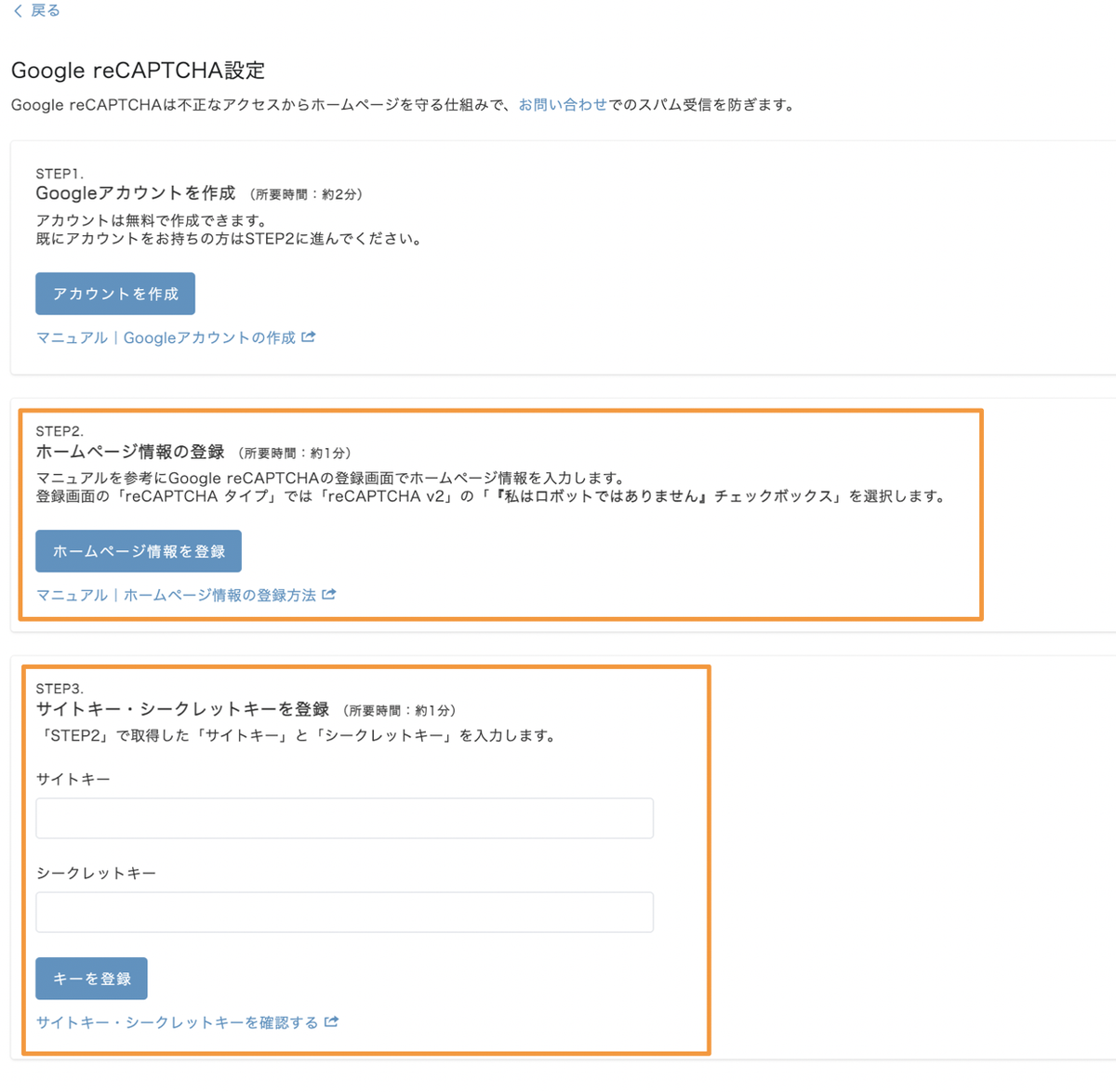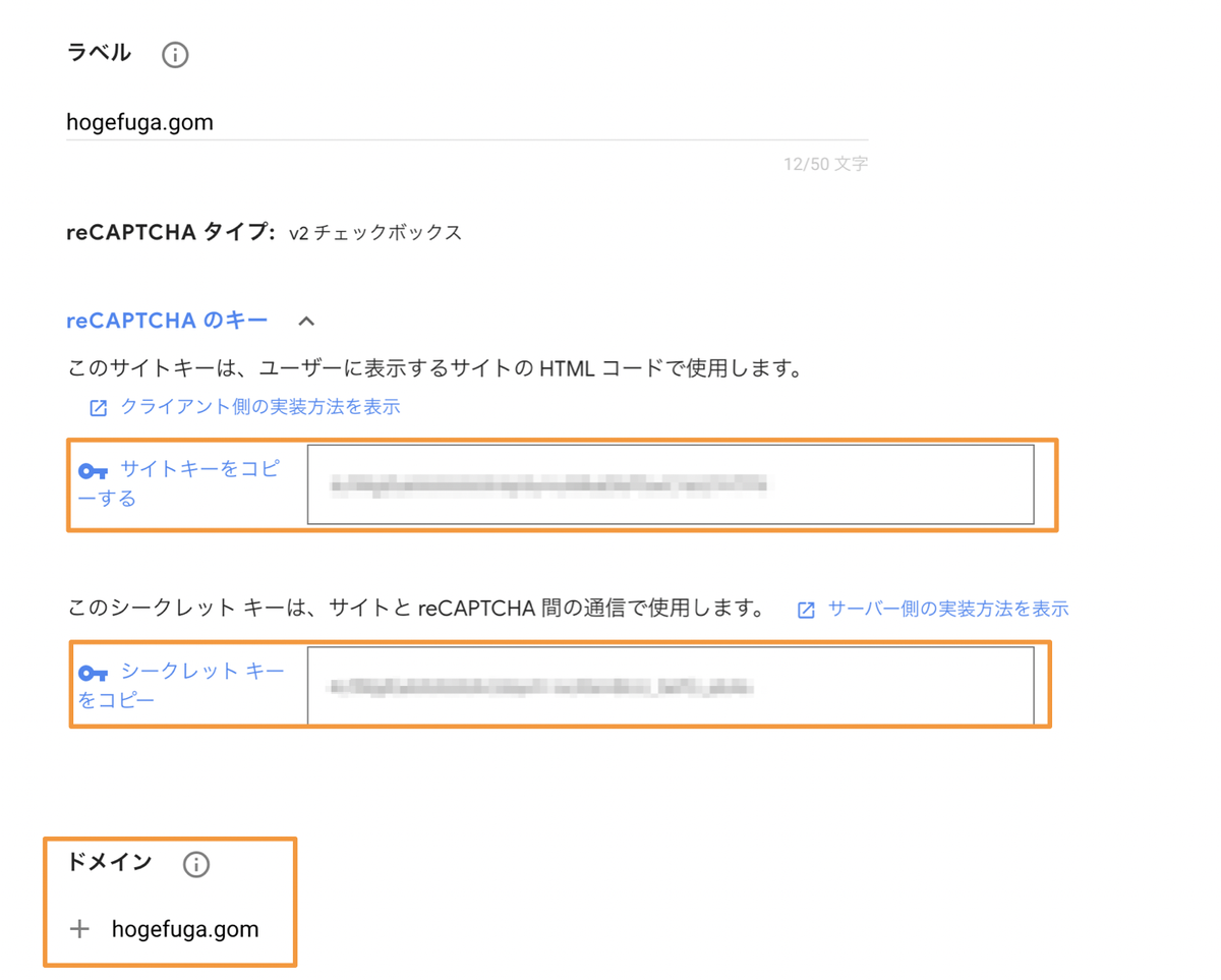 - シークレットキー: サーバサイドでreCAPTCHAを使ったスパム判定を行う際に必要な値