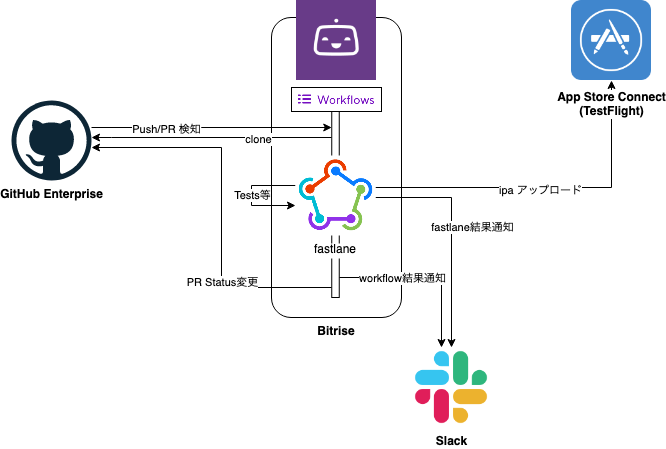 - BitriseからGHEへのアクセスの際の設定、clone、PR Statusの操作といったGHEの操作