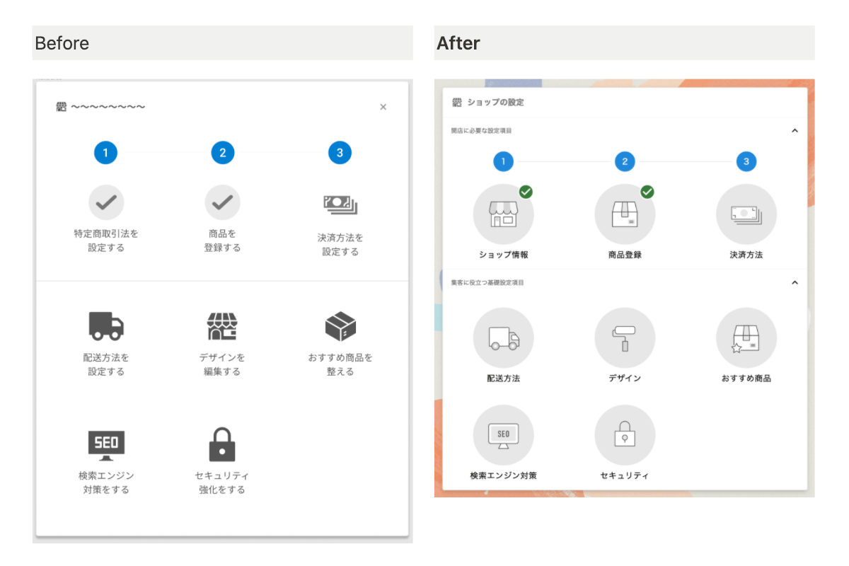 これはカラーミーショップに登録したユーザーさんが最初に管理画面のトップに来たときに目にする設定項目です。この図だと、「特定商取引法を設定する」、「商品を登録する」までは設定しているような状態になってます。今回はここに現れている各項目をUIデザイン上考慮すべきオブジェクトとし、その性質と命名について考えていきます。