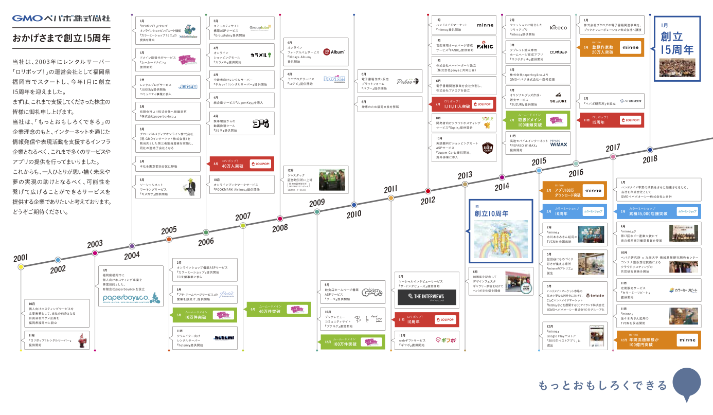 GMOペパボは、前述の通りクリエイターのインターネット上での表現活動を支援するための多種多様なサービスを世に問うてきました。祖業のロリポップ!を始めとするホスティング事業、カラーミーショップを中軸とするEC支援事業、ハンドメイド作家と購入者をマッチングするためのプラットフォームであるminneや、イラストレーター等のクリエイターがデジタル作品をグッズ化することで収益を得られるSUZURIなどがあります。GMOペパボの創立15周年の際に、以下の通りまとめたものがあります。