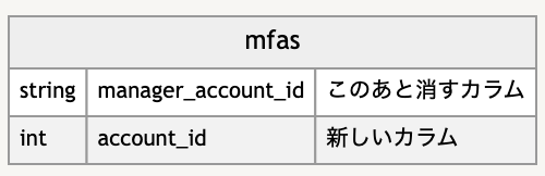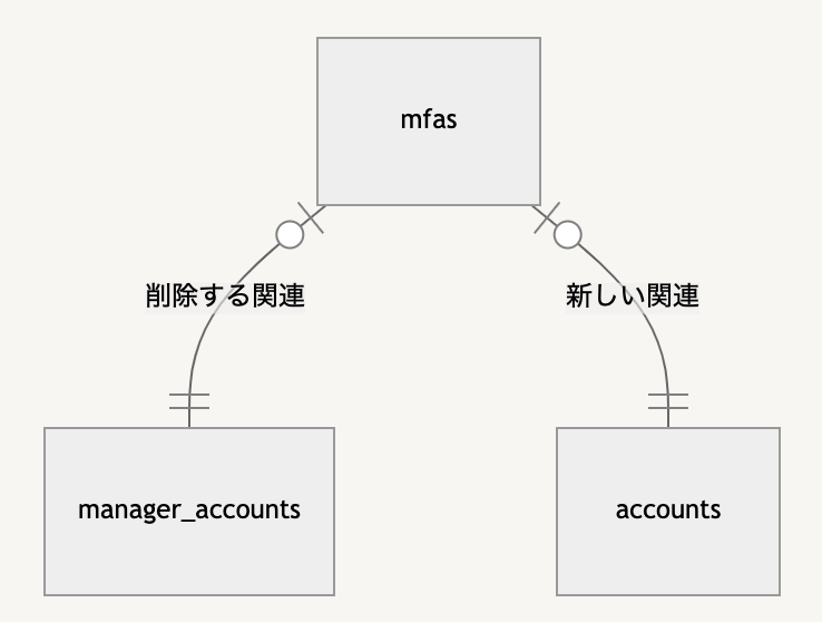 2要素認証(2FA)設定テーブル(mfasとします)は、従来はショップ主管理者テーブル(manager_accountsとします)に対して外部キー制約を持っていました。しかし、副管理者の認証強化に伴い、ショップを管理する主副管理者を抽象化したショップ管理者テーブル(accountsとします)に対して外部キー制約を持つカラムを追加する必要が生じました。