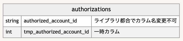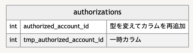 この事例について、仮にauthorizationsというテーブルの文字列型のカラムauthorized_account_idの名前を変えずに整数型のカラムに変える、という状況を想定して説明します。