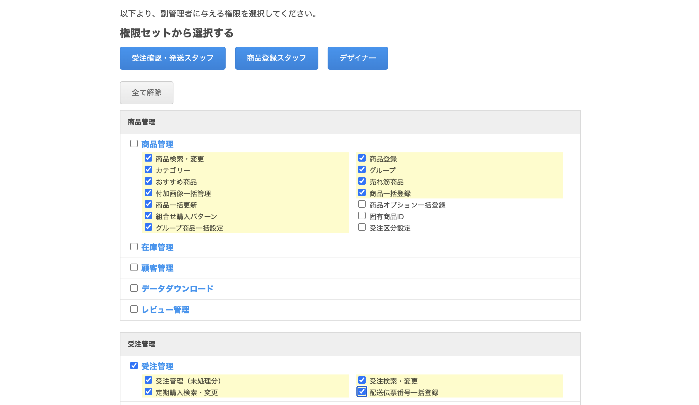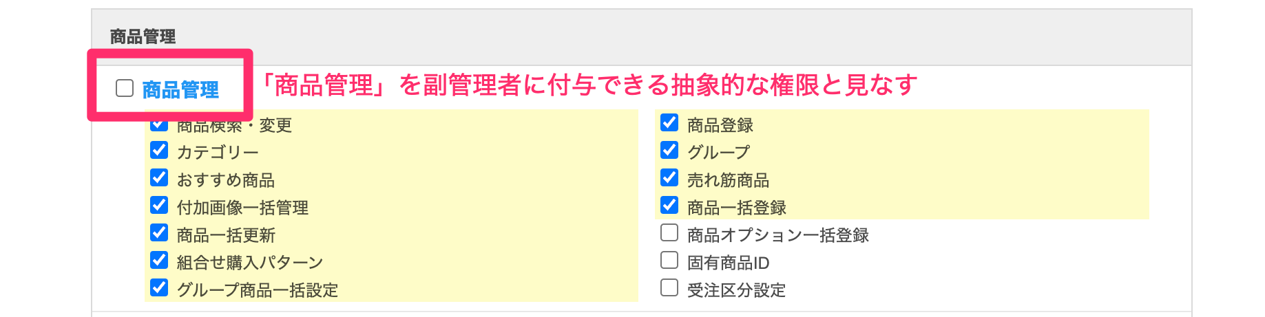 例をあげて説明すると、次のような「商品管理」のカテゴリを権限と見なすということです。「商品管理」に紐づく最小粒度の権限すべてを副管理者に付与すると、副管理者は「商品管理」の権限を持っていると見なすのが自然です。
