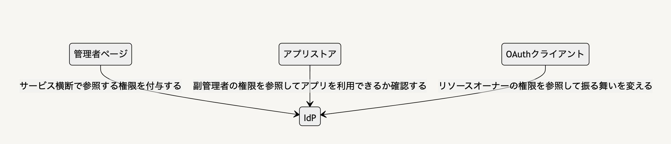 このIdPを通じて、リソースオーナーにどのような権限が付与されているかを参照できるようにします。具体的にはリソースオーナーのロール(ショップオーナー、副管理者)と権限の一覧を返すAPIエンドポイントを提供し、このエンドポイントをOAuthやOIDCで取得できるアクセストークンで呼び出せるようにします。ショップオーナーは管理者としてつねに全権限を持つものとし、副管理者は先述した抽象度の権限の一部を持つものとします。エンドポイントは次のようなJSONを返すイメージです(キー名などは仮のものです)。