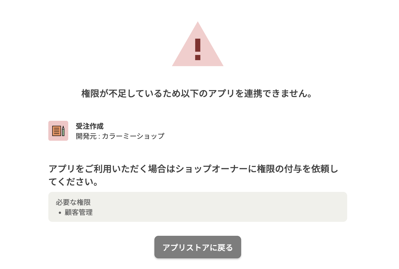 一方で、スコープと権限を紐づけておくと、副管理者に権限がないのでアプリを通じて利用するカラーミーショップAPIが使えないという体験を防ぐことができます。たとえば、read_productsスコープと「商品管理」権限を紐づけておくことを考えます。このとき、read_productsスコープを持つアプリを認可しようとする副管理者が「商品管理」の権限を持っているかを紐づけに基づいて認可のタイミングでチェックすると、アプリを使い始めてから権限が足りないことに気づかずに済みます。