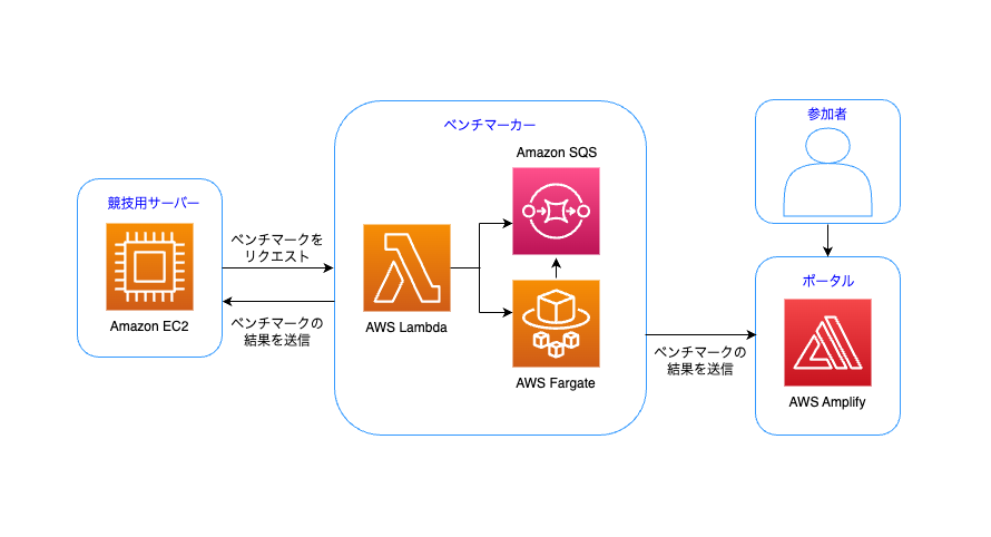 競技用サーバーからのベンチマーカー起動と、結果をポータル画面で表示する一連のプロセスは、GMOペパボではない若手エンジニアの方々に実装を行っていただきました。競技用サーバーからのリクエストの際にIPアドレスを取得し、これをSQSへメッセージとしてキューに入れることから始まり、Lambdaがその情報に基づいてECSタスクを起動し、ECSタスクがSQSからメッセージを取得してベンチマーカーを実行し、その結果をポータル画面のスコアに表示するまでの一連のプロセスをGoで実装されており、とても学びになりました。