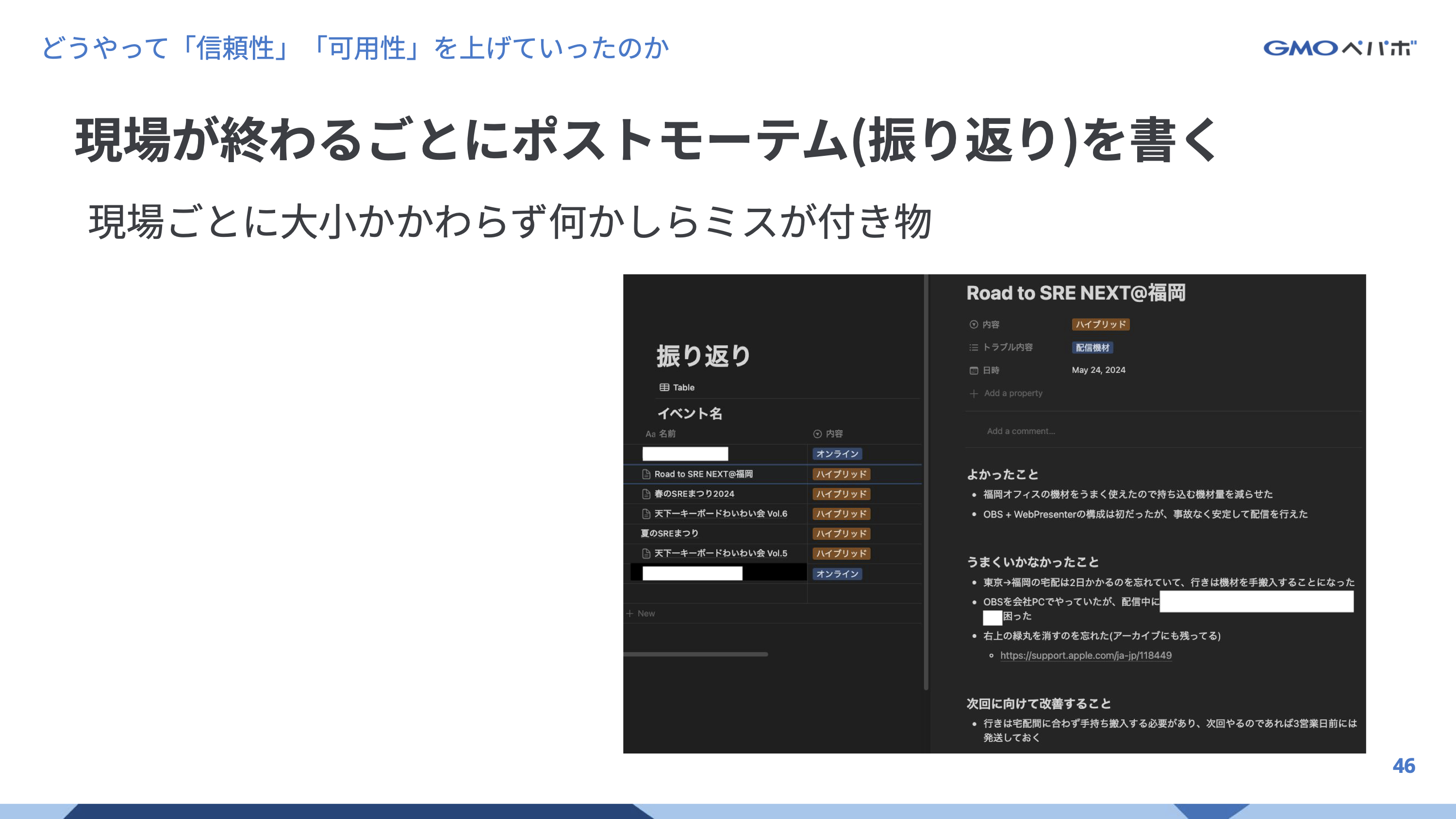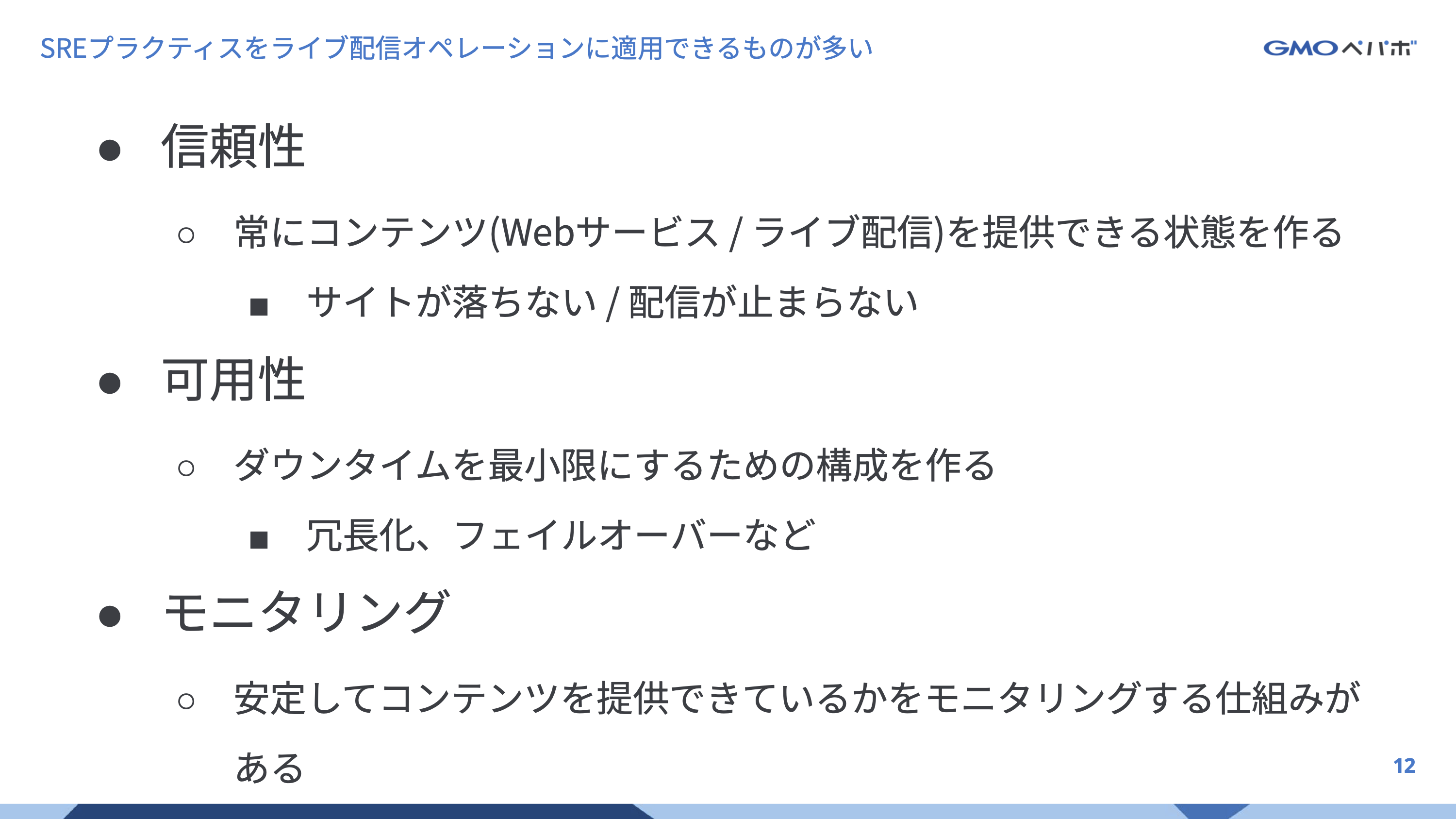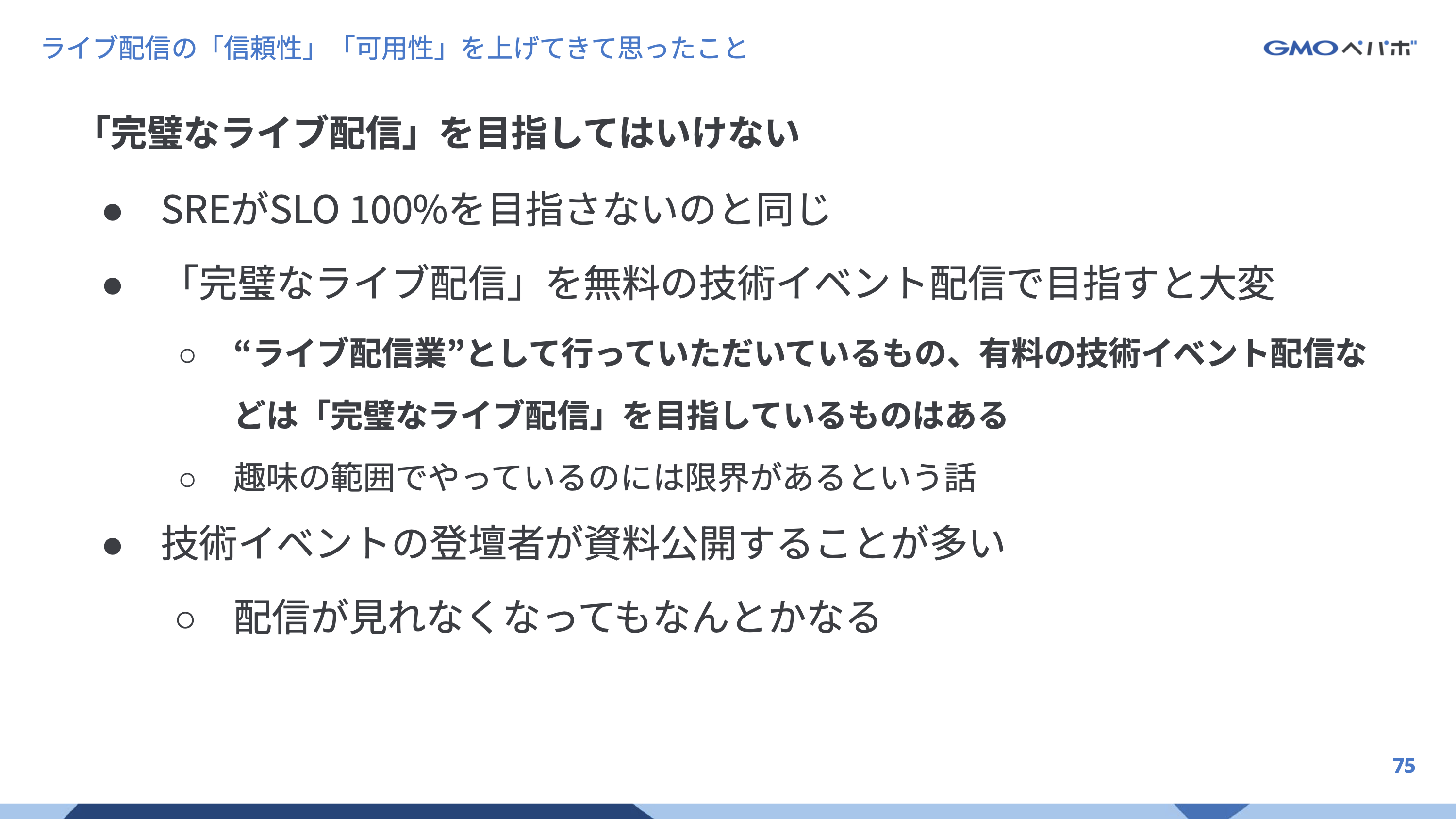 このようなライブ配信を行ってきた経験から得たトラブルや大変さなどを「信頼性」や「可用性」を軸とした改善を行ってきた話を行いました。