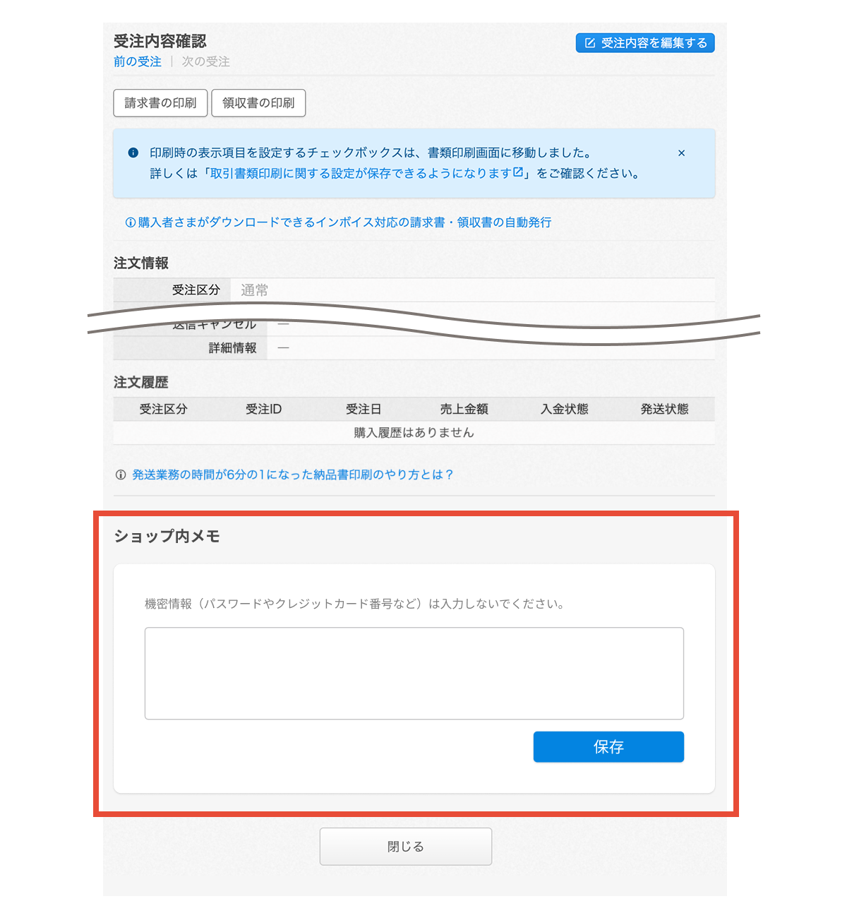 - 受注画面への設置: スタッフ間の連絡事項等を記入できる専用スペースを用意
